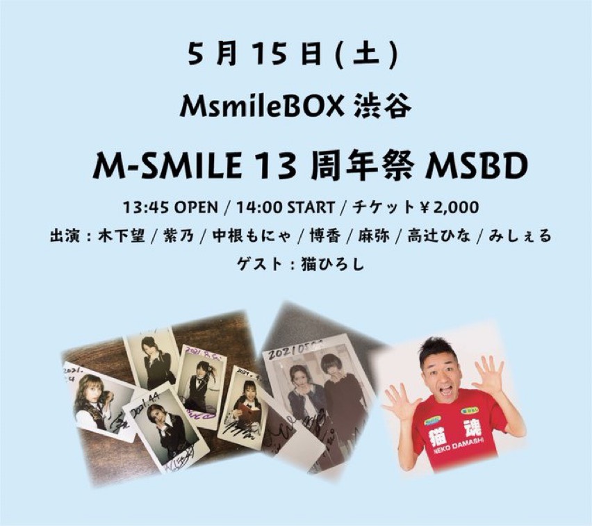 猫ひろし出演情報 MーSMILE 13周年祭 MSBD 5月15日(土) MsmileBOX渋谷 13:45 OPEN 14:00 START チケット ¥2,000 スポンサードリンク Facebook Google+ B!はてな Twitter Pocket