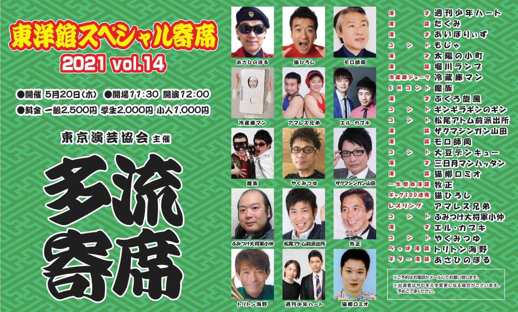 東洋館スペシャル寄席2021 Vol.14「多流寄席」 東洋館スペシャル寄席2021 Vol.14「多流寄席」 2021年5月20日(土) 開場:11時30分 開演:12時00分 【料金】 大人:2,500円 学生:2,000円 小人:1,000円 会場:浅草東洋館 スポンサードリンク Facebook Google+ B!はてな Twitter Pocket