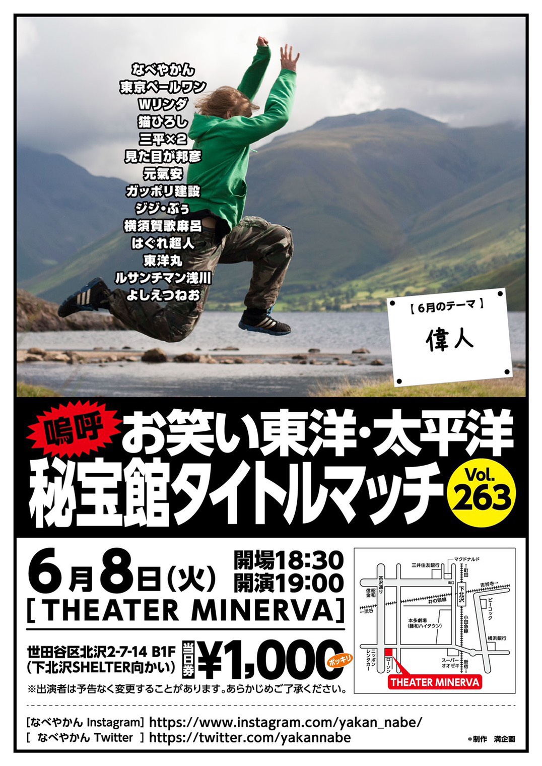 お笑いライブ「東洋太平洋秘宝館タイトルマッチ」 嗚呼お笑い東洋・太平洋秘宝館タイトルマッチライブvol.263 日時:2021年6月8日(火) 開場:18:30 開演:19:00 会場:THEATER MINERVA TEL.03-3413-8420 (東京都世田谷区北沢2-7-14 B1F ※下北沢SHELTER向かい) 料金:1,000円[当日券のみ] スポンサードリンク Facebook Google+ B!はてな Twitter Pocket