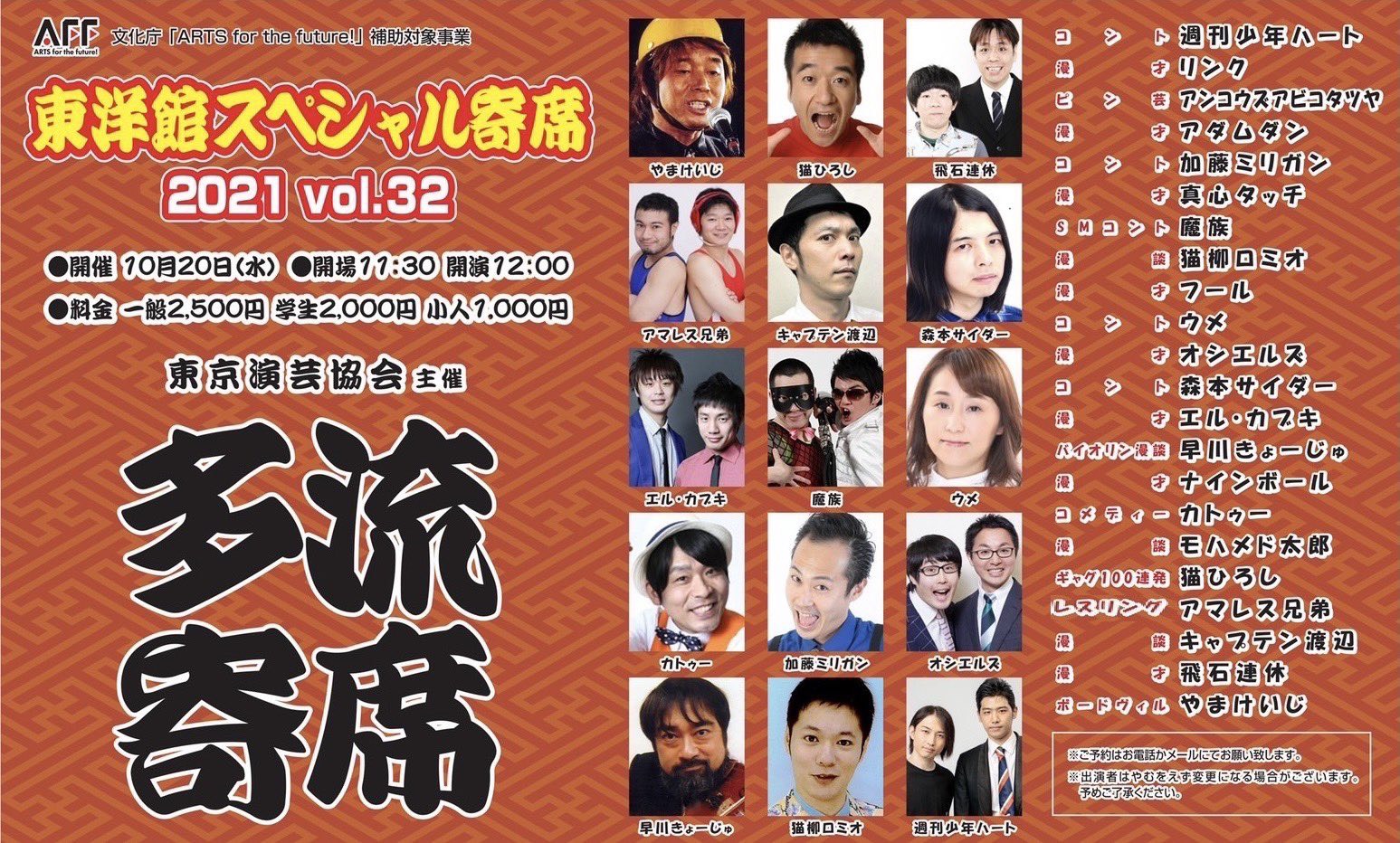 東洋館スペシャル寄席2021 Vol.32「多流寄席」 東洋館スペシャル寄席2021 Vol.32「多流寄席」 2021年10月20日(土) 開場:11時30分 開演:12時00分 【料金】 大人:2,500円 学生:2,000円 小人:1,000円 会場:浅草東洋館 スポンサードリンク Facebook Google+ B!はてな Twitter Pocket