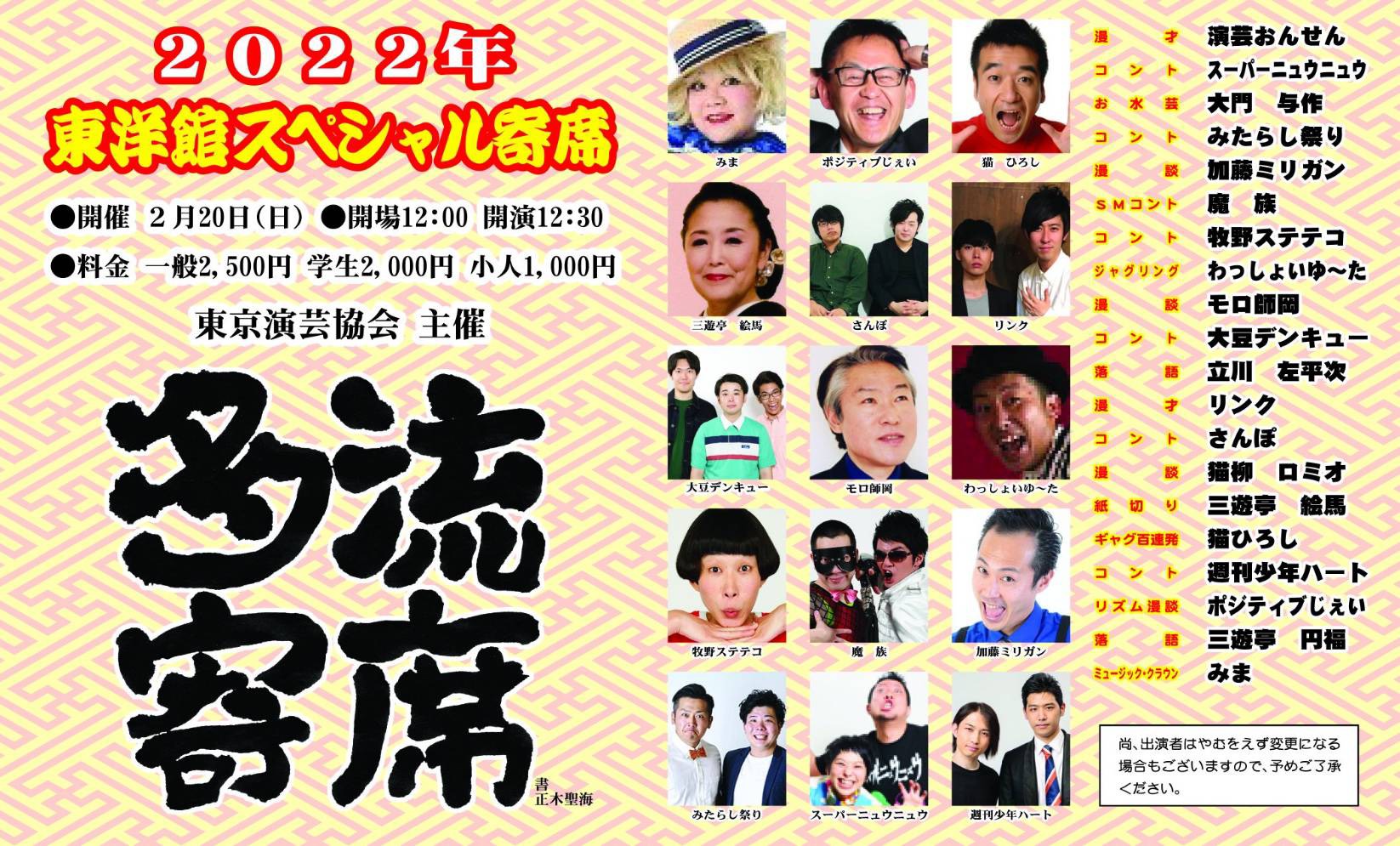 2022年 東洋館スペシャル寄席「多流寄席」 2022年 東洋館スペシャル寄席「多流寄席」 2022年2月20日(月) 開場:11時30分 開演:12時00分 【料金】 大人:2,500円 学生:2,000円 小人:1,000円 会場:浅草東洋館 スポンサードリンク Facebook Google+ B!はてな Twitter Pocket