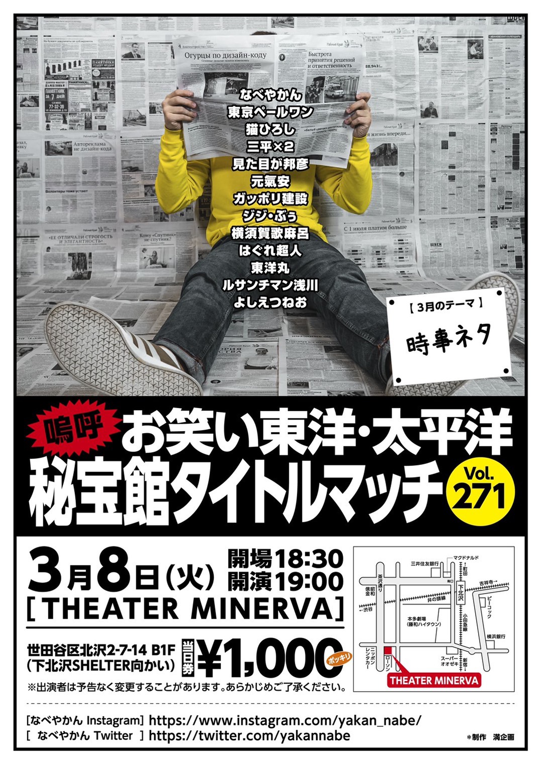 お笑いライブ「東洋太平洋秘宝館タイトルマッチ」 嗚呼お笑い東洋・太平洋秘宝館タイトルマッチライブvol.271 日時:2022年3月8日(火) 開場:18:30 開演:19:00 会場:THEATER MINERVA TEL.03-3413-8420 (東京都世田谷区北沢2-7-14 B1F ※下北沢SHELTER向かい) 料金:1,000円[当日券のみ] スポンサードリンク Facebook Google+ B!はてな Twitter Pocket